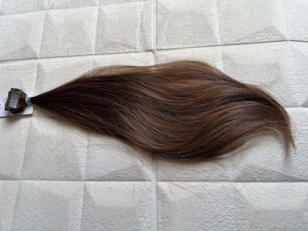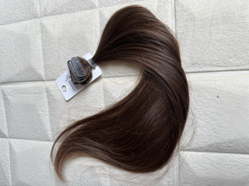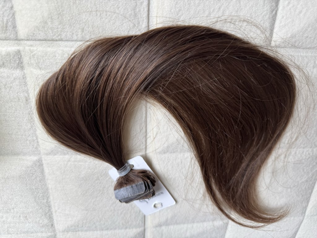 Nanotape české nebarevné jemné vlasy na páskách 2,8 x 08 cm . Délka 35 - 38 cm. Odstín hloubky 7.